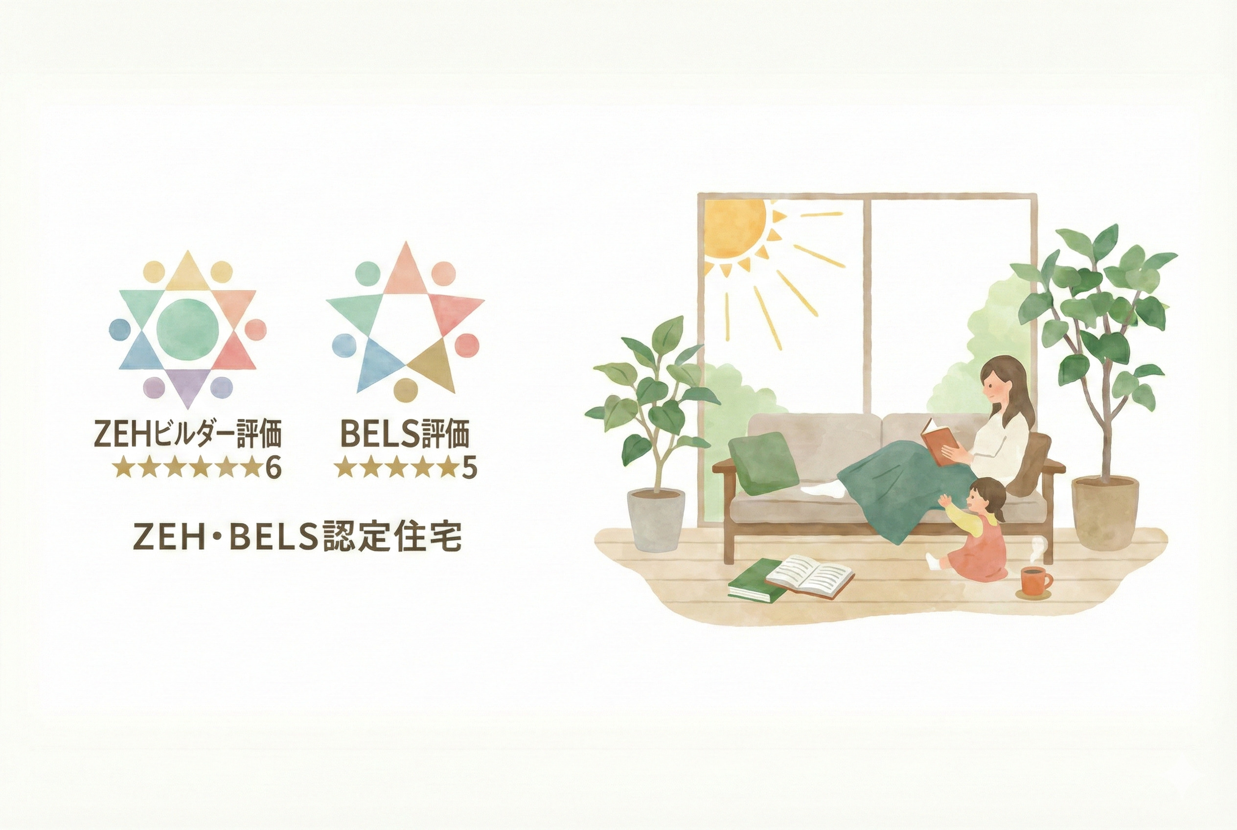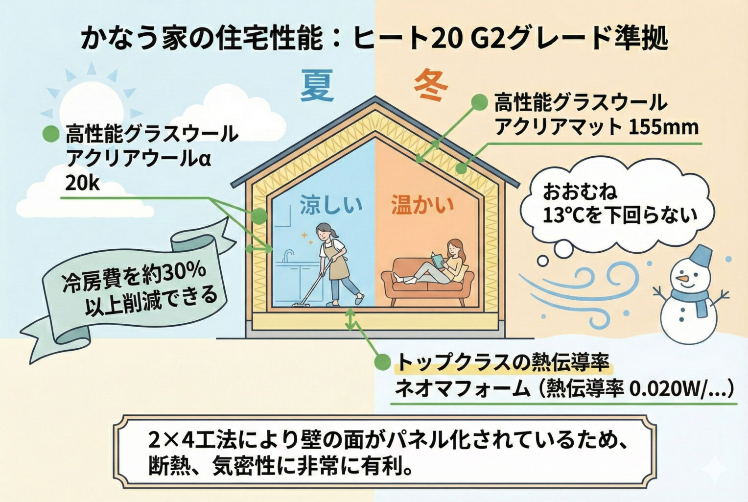 かなう家は、大手ハウスメーカーと同等以上の断熱・気密性能で、夏は涼しく、冬はあたたかい快適空間を実現します。しかも最高ランクの耐震性能とZEH基準の省エネ性で、光熱費も安心。